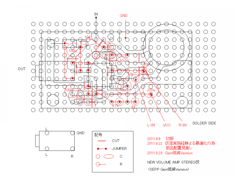 また出力側の発振止めCRだが、先の回路図ではJACK側に入れてあるが、実装図ではIC側になっている。