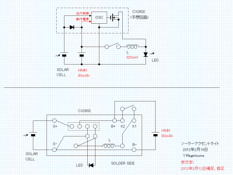 ・発振回路とMOSFET(BipTrかもしれません)は、Lとともに、LEDが点灯させる電圧を得る為の昇圧回路で、日中の点灯を防止する為に太陽電池の出力電圧により、LEDの点灯を禁止する回路があるものと思います。