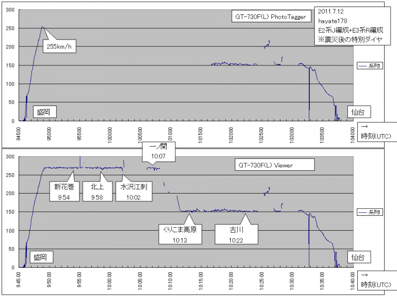 改めて、新幹線乗車時のGT-730F(L)にて取得し「PhotoTagger」でD/Lしたlogを調べたところ、255km/h超のログのデータが欠落している事を確認した。