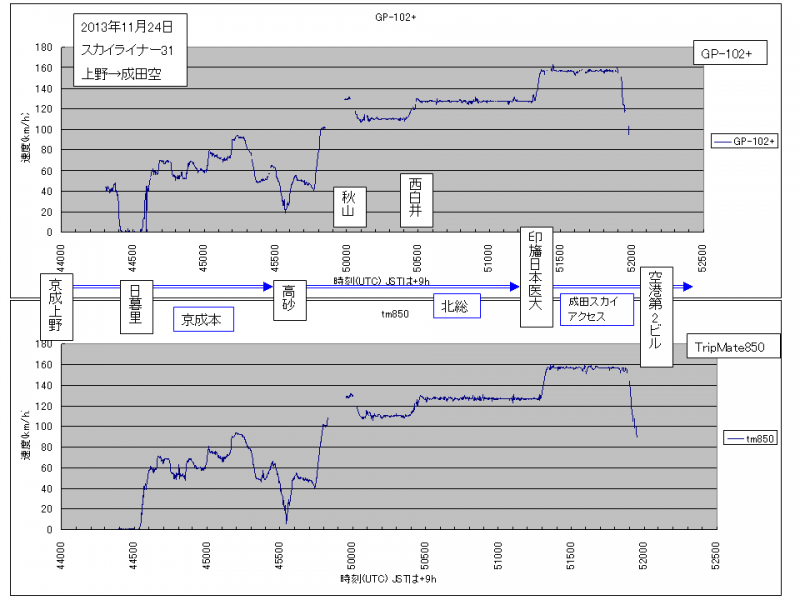 秋月の店頭を出てすぐ電源ONし、そのままLOGを継続。上野に移動し「スカイライナー」に乗車。