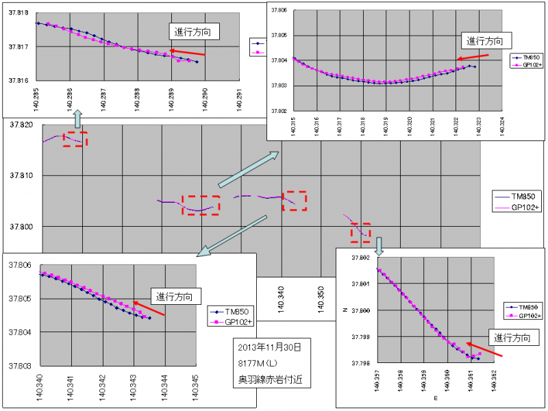 奥羽本線板谷峠の赤岩付近を走行中の列車のログで、TripMate850(MTK3229)との軌跡を比較したのがこの図。