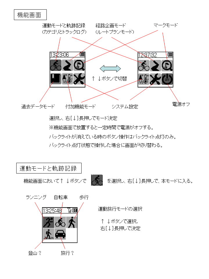 機能画面〜運動モードと軌跡記録