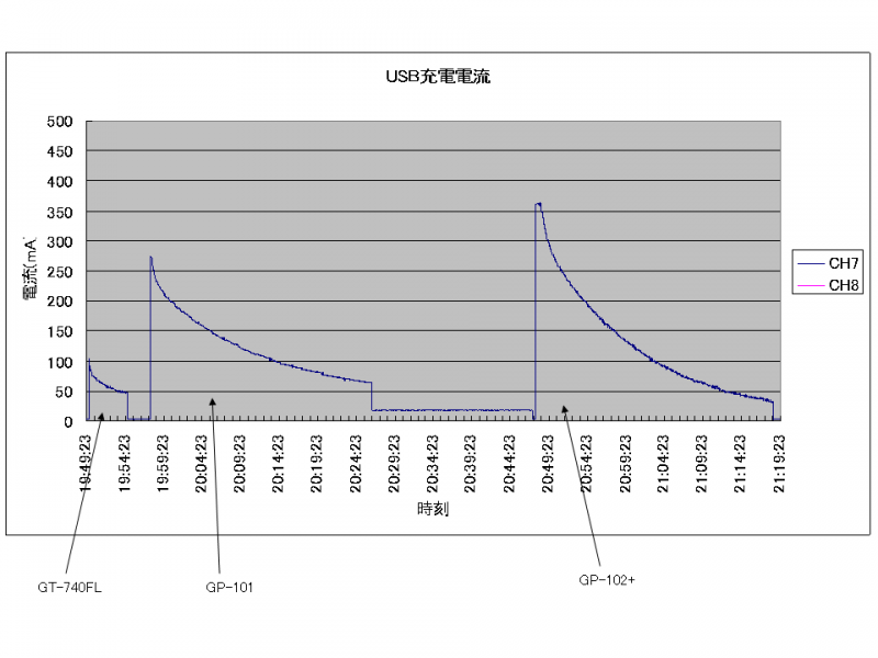製作した回路を使用し、実際にUSB機器の充電電流を測定してみました。