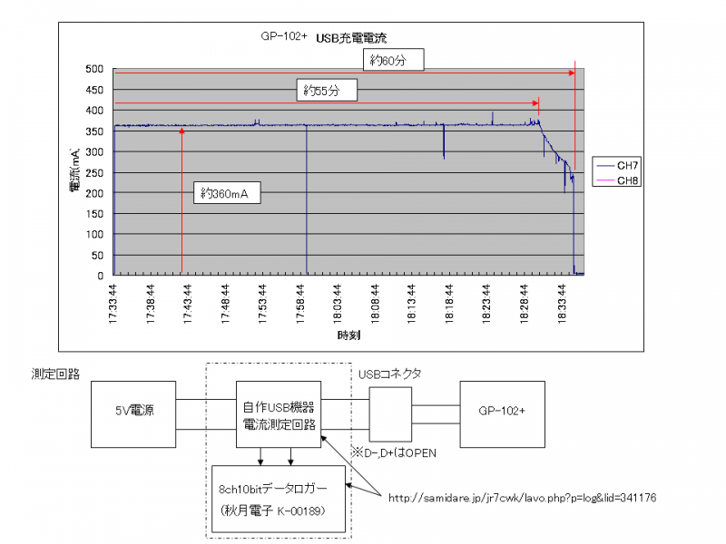 ・充電中は最大で360mA程の電流が流れ、55分程経過した頃から電流が低下し始め、60分程で充電完了する。(なおデータシート等には充電時間の記載はなかったと思います。)