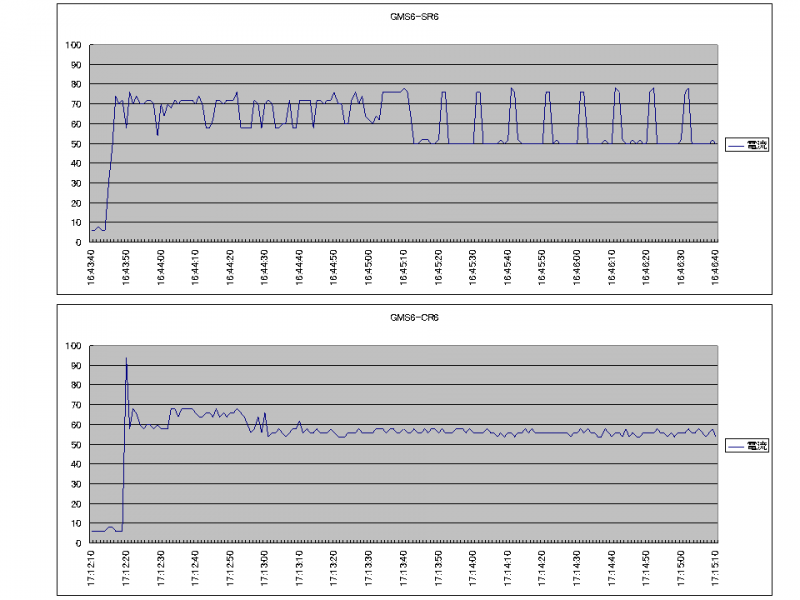 またGMS6-CR6は比較的電流の変化が少ないのに対し、GMS6-SR6は電流の変化が大きい事がわかる。