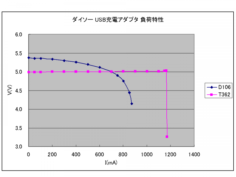 測定の結果、私が入手したキューブ型の「D106」は5Vの5%減である4.75Vを切るのが800mA程,平型の「T362」は1160mA程であった。
