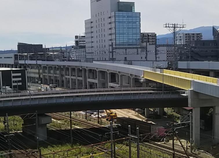 ▼山形新幹線上りアプローチ線>6/27工事状況>商業施設駐車場より1