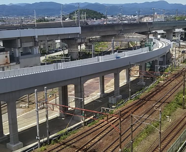 ▼山形新幹線上りアプローチ線>6/27工事状況>商業施設駐車場より2