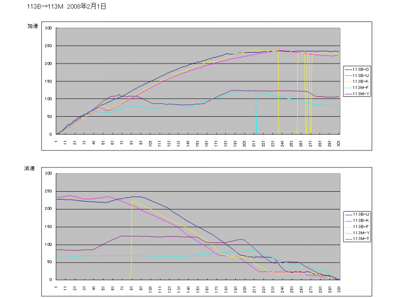 続いて加減速曲線。(在来区間分も1枚のグラフに重ね書きしてあります。)