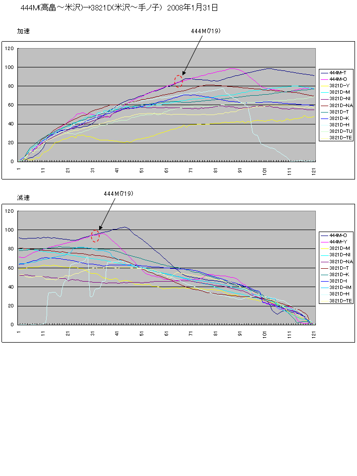 データを載せた山形線ローカル電車444Mですが、高畠駅が1番線,置賜駅2番線着発で、ともにポイントを渡る関係で、加速を抑えていると思われます。