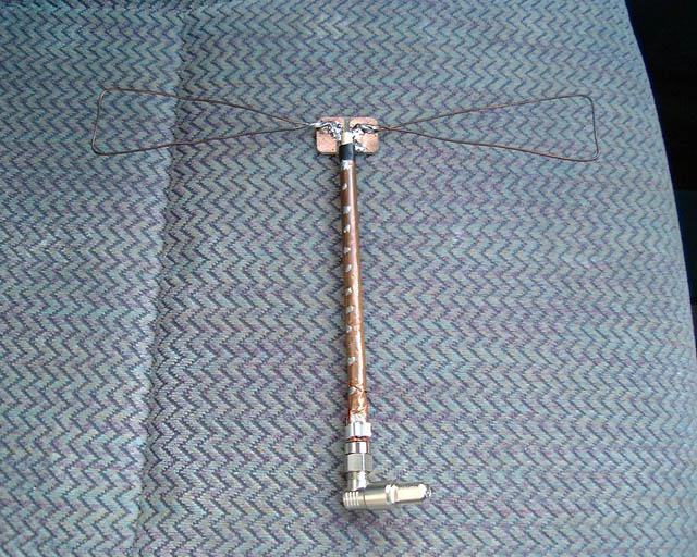 基本的には2分の1波長のダイポールアンテナですが、家庭用のUHFアンテナを参考に蝶型のエレメントにしています。
