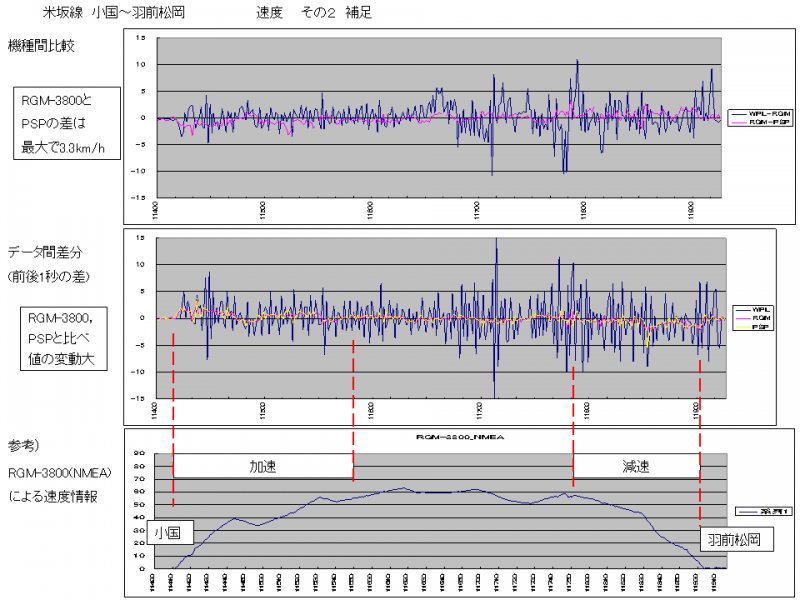 グラフ上は機種間のデータの比較、中のグラフは同じ機種でのデータ間の差(1秒間隔で取ったデータのデータ間の差)を示したもの。