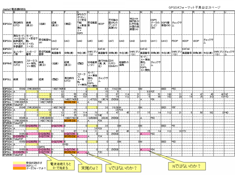 電波が途絶えた時に緯度・経度が"0-"で始まるデータが出力されます。(「トンネル効果」が設定されている時のみ)