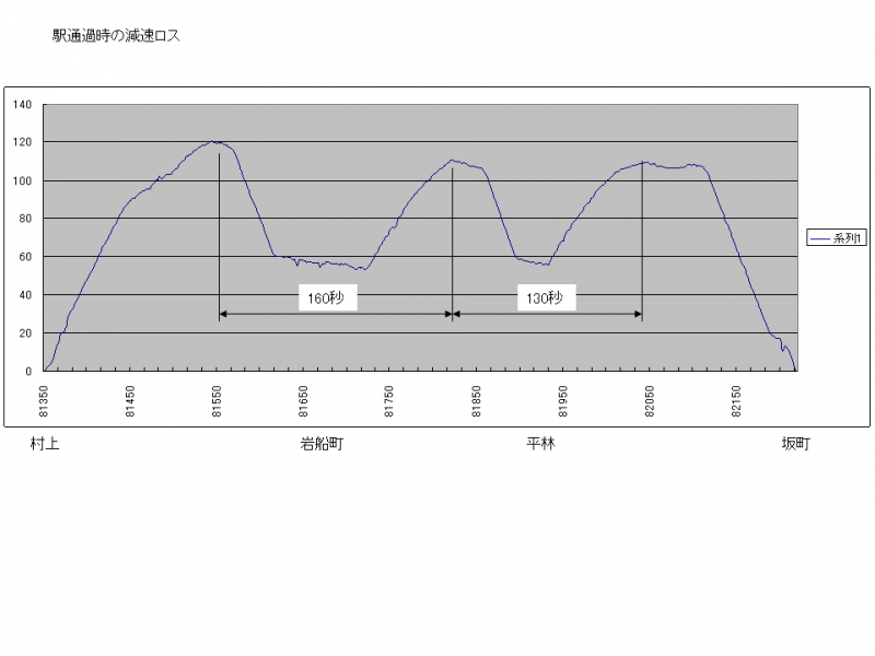 岩船町:現状 減速〜加速で約160秒,約3500m要している。