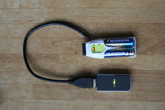 手持ちにそのような電源がないので、地元のセブンイレブンで格安で売られていた携帯電話用の充電器(TOPLAND製PDC用,単三2本使用電池交換可能タイプ,オキシライド電池付き)にUSBコネクタ付けてみました。