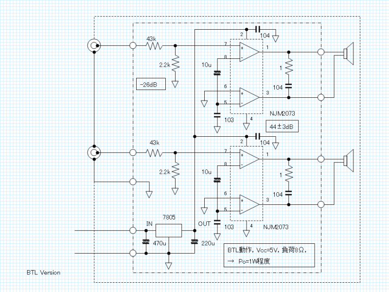 NJM2073DでBTL出力パージョンで製作。ICは2個。