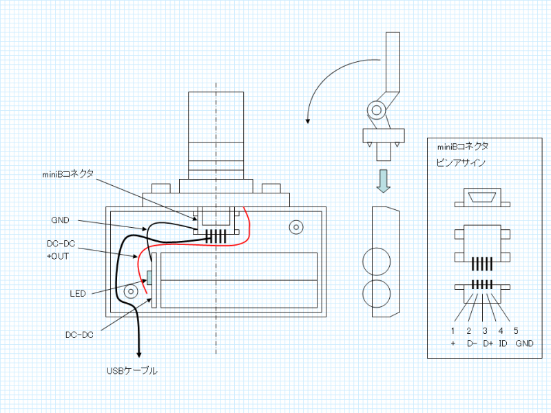 12月30日の書き込みで紹介した変換コネクタを分解し、USBminiBコネクタを取り出し、ダイソーで買ってきたUSB A-miniBのケーブルのA側を切断して接続。(今回使用したのは、白と緑が逆に接続されていました。・・・要注意です。)