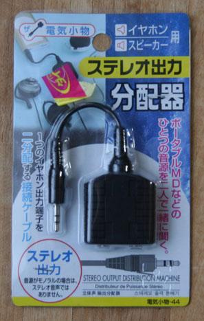 単品のSTEREOジャックが2個そのまま入っているという、ダイソーの分配器(写真)をばらして、STEREO入力からL,Rに振り分けるよう接続を変更し、今回買ってきたスピーカーをつないでみました。