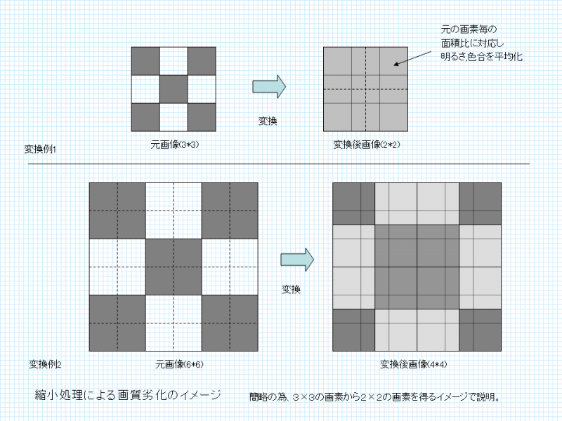 分数比の縮小の為、元画素間の「平均化処理」が必要となり、画質が劣化。
