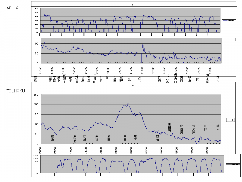 上のグラフが阿武隈急行で、下のグラフが東北本線。