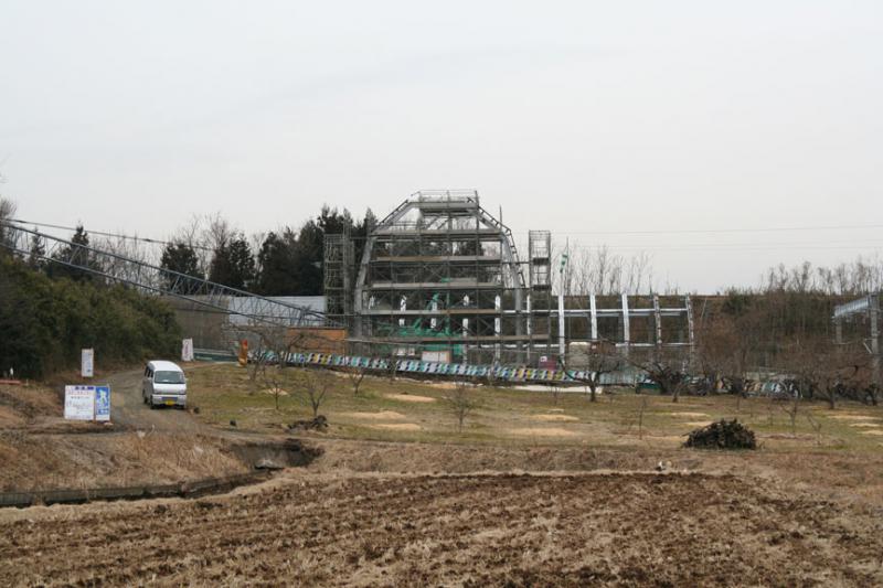 柱の組立は隣の畑の辺りで行い、クレーンで吊って据えられるようです。