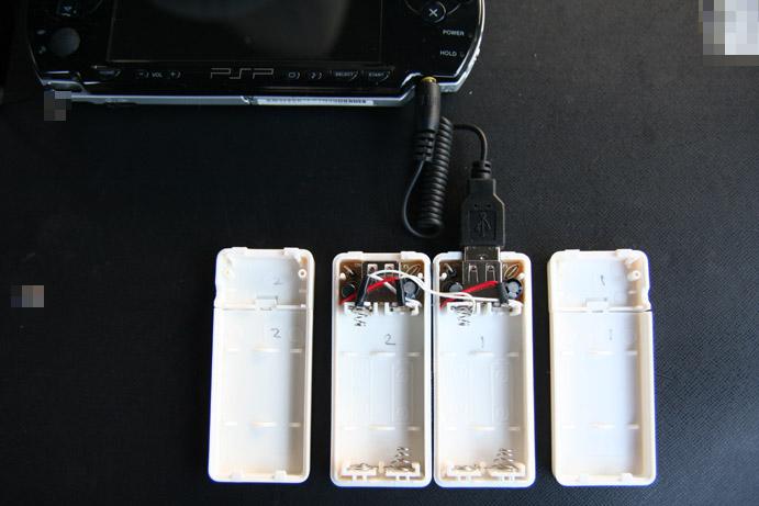 そこで、電池を2本から4本に変更する事で昇圧能力を増強し、PSPの電源が入った状態、しかもPSPの電池が放電し切った状態からでも充電出来ないか、という実験を行ってみた。