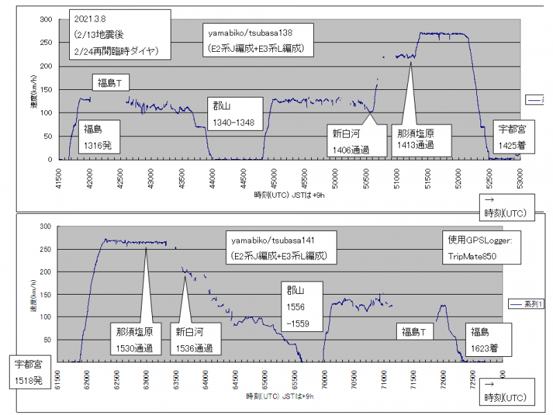 乗車したのは「つばさ(やまびこ)138号」で、グラフは福島-宇都宮間。