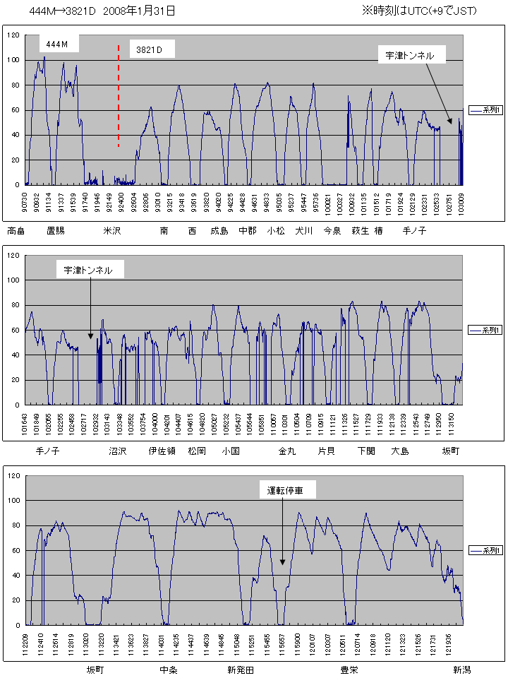 米坂線〜羽越線〜白新線経由で米沢駅〜新潟駅間を結ぶ「快速べにばな1号」の運行曲線です。