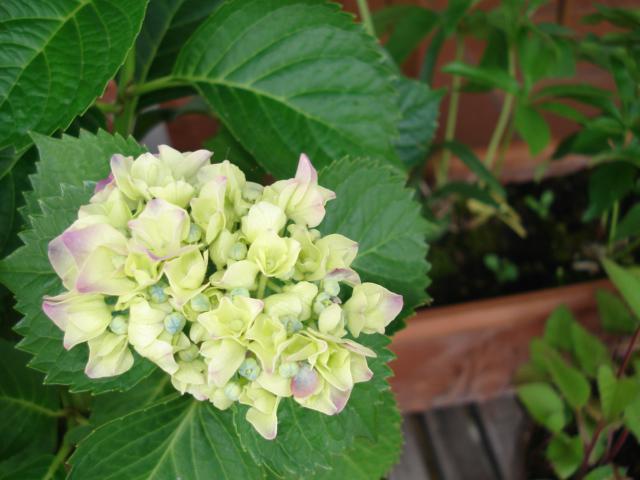 お店の前のあじさいがうっすらと色づいてきました。