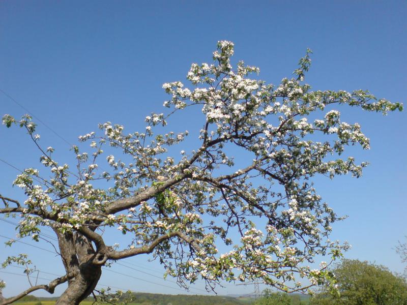 写真はりんごの花。3本あって、みんな違います。これはいちばん早い木。今花摘みを手の届くところだけやっています。