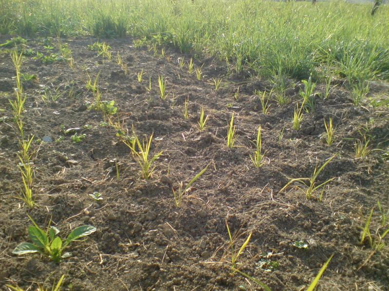 稲はまだ苗を植え付けた時から、1cmほど伸びただけで、必死に干ばつと闘っています。
