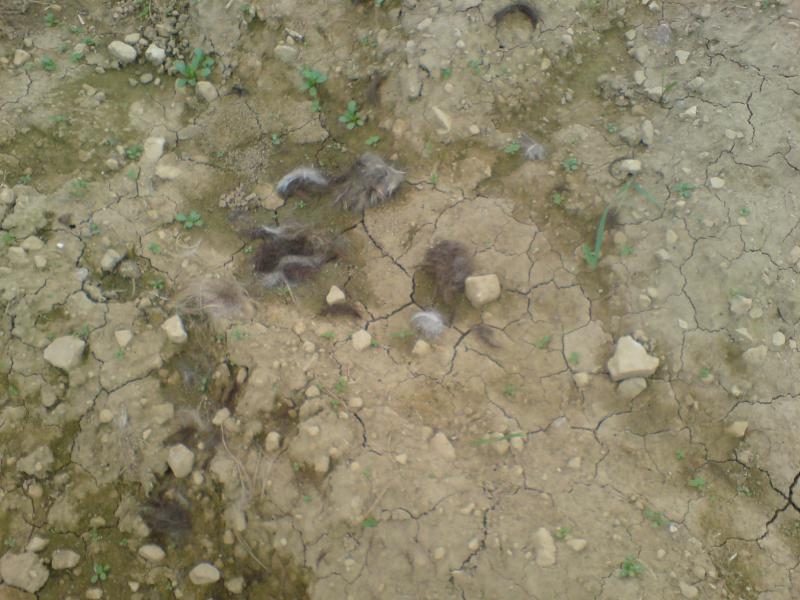 畑の中に転がっている、この変な黒白茶色のもの・・・これ、牛の毛なんです。イノシシ除けなんだそうです。数日前畑に行ったら、「何これ?犬のブラッシングでもしたのか、誰か?ここで?」そしたら、あるわあるわ、これはどう考えても故意にここへ撒いたとしか思えない・・・。何かのおまじないか、肥料か?パーマやさんから貰ってくるのかしら。人毛なら気持ち悪いなあ・・・」と、あれこれ思っていました。今日、畑の持ち主の友人に聞いたら、なんと、「牛の毛」で、イノシシ除けだって言うじゃありませんか。