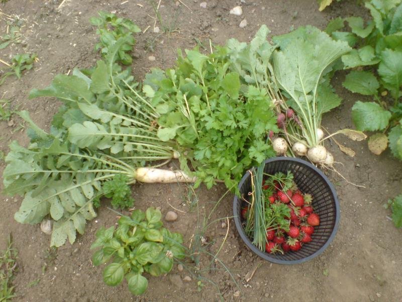 真ん中はイタリア人の畑からもらったルッコラという葉物野菜とイタリアンパセリ。