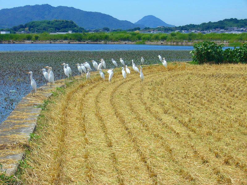 コンバインで稲刈りしているすぐそばにたくさんのサギが応援に来るんですよ。ほんで、コンバインの動く所にピッタリくっ付いて歩きながら応援するんです。私がカメラを持って近付くと、飛び立ちます。私が見えなくなると、また来るんです。20〜30羽位のサギがね?不思議でしょう!