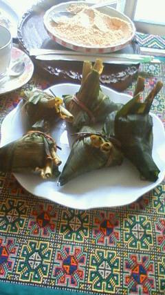 餅米、灰汁、水、ダチク(竹の一種)の葉、ミチシバが原材料である。写真の通り、一人一個といったところであるが、菅野先輩のように体の大きい人は、一回に2〜3個食べる人もいる。普通、一人一個食べれば十分である。