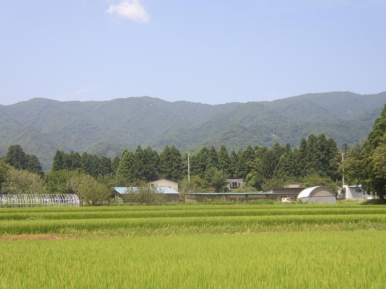 写真は朝日連峰を背にした我が家の遠景。前は鶏舎。ダブルクリックで拡大できます。