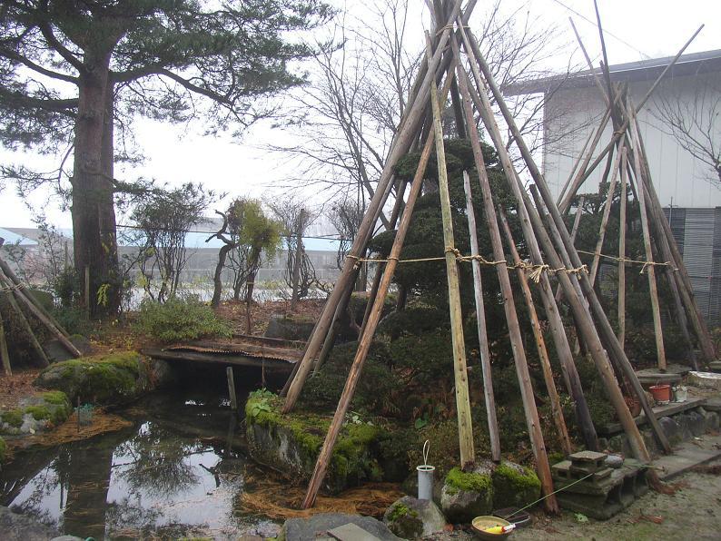 雨が降っていたけれど、やるしかないな。合羽を着ながらの作業となった。一本、一本と、丸太を運び、組み合わせていく。冷たい雨の中、鼻水たらしながら、ようやく夕方にはおわったよ。金沢の兼六園のような芸術的なものではないけれど、仕上がってみると、なかなか風情がある。