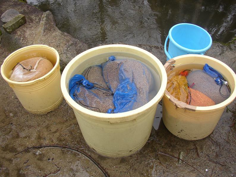 モミを60度のお湯に5〜7分ほどつけたあと、今は水の中に浸している。