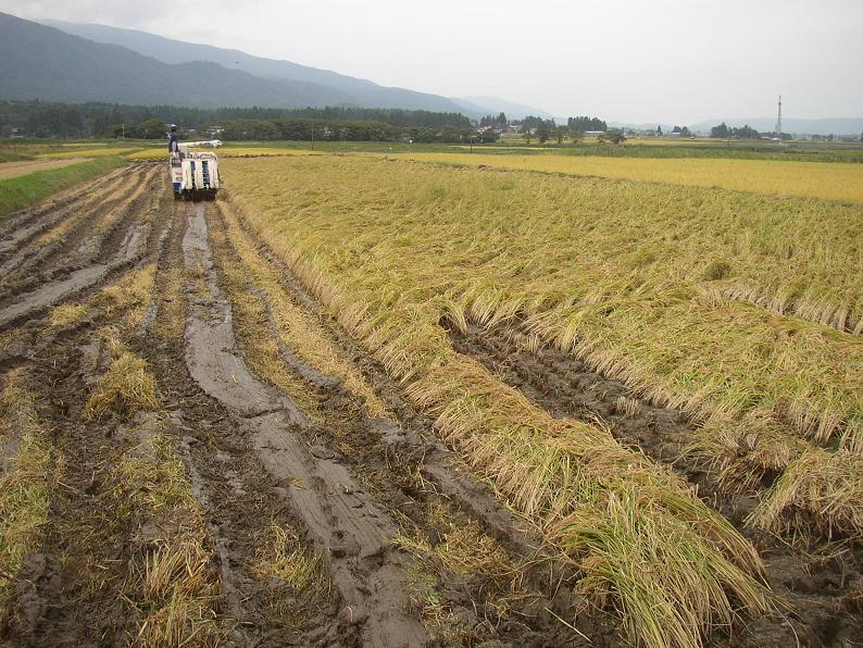 暑い夏から一転して雨続きの秋。田んぼがぬかるみ、稲刈り作業が思うように進まない。それでも何とかコンバインが稼動できる圃場はあるのだが、中には全く入れないところもある。写真の田んぼは地下水が高く、雨が続けばすぐにぬかるんでしまう。おまけに稲が倒れていて、無理に入ればキャタピラーの押し出す泥で隣の稲が埋まってしまうのだ。こんな田んぼが4枚、あわせて75a(75m×100m)もある。