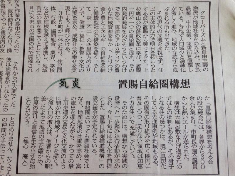 私たちが取り組んでいる「置賜自給圏構想」が地元新聞のコラムに載りました。