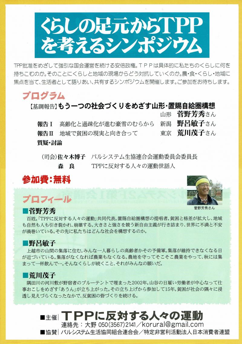 10月29日、「くらしの足元からTPPを考えるシンポジューム」(主催;TPPに反対する人々の運動*協賛;生協パルシステム、日本消費者連盟)に行き、そこで「もう一つの社会づくりを目指す・置賜自給圏構想」と題した話をしてきました。