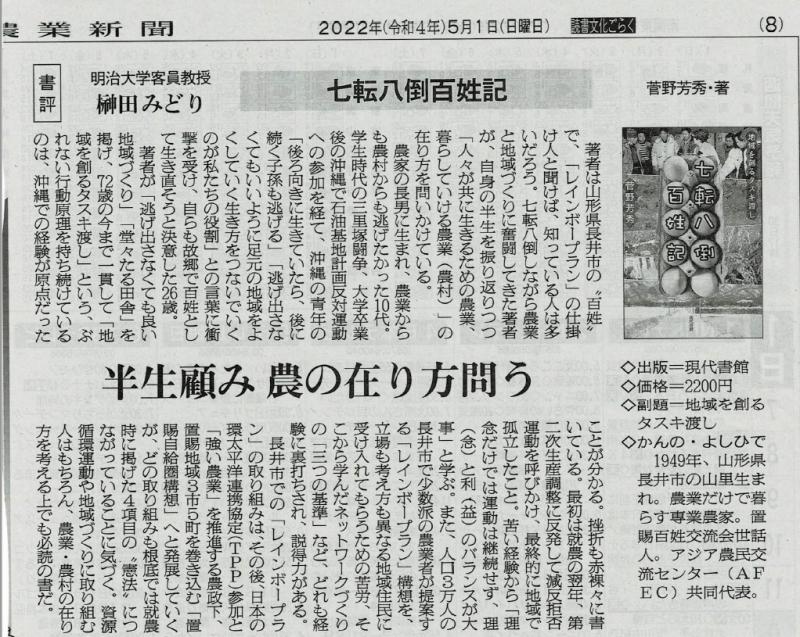 拙本「七転八倒百姓記」について、私の古くからの友人で農政ジャーナリストの榊田みどりさんがありがたい書評を書いてくれました。日本農業新聞です。左のダブルクリックで読むことができます。