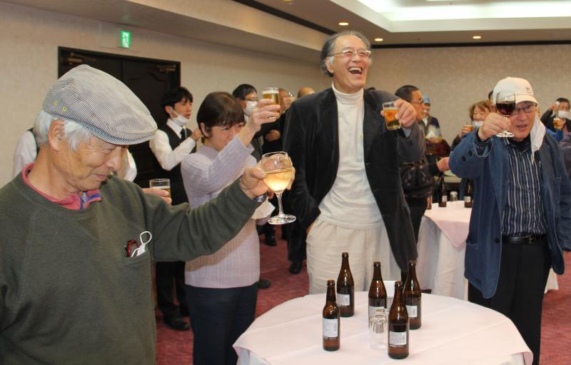 左から三里塚の石井恒司さん、農業ジャーナリストの榊田みどりさん、一人おいて置賜百姓交流会の新江洋一さん。なぜか一人だけ、大口開けて笑っているノー天気な奴がいる。みんなシミジミトと「献杯」しているんだよ。バッカじゃないか、こいつ。