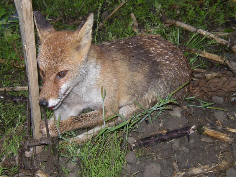 ようし、来るなら来てみろ。罠を仕掛けて待った。数日たって、早朝、奴がやってきた。ニワトリ達が騒いでいる。鶏舎に向かって走っていった。まだ薄暗い鶏舎の外を、見たことのない「けもの」がぴょこぴょこと罠を引きずりながら逃げていく。奴だ。逃がしてたまるか。ようやく追いつく。「バシッ、バシッ」思い切りひっぱたいた。倒れた「けもの」をまじまじと眺めた。何だこれは・・・。大きさは中型犬ぐらいか。尻尾をいれなくても頭からお尻までで70cmぐらいはある。大きい。色はベージュに灰色が入っている。足が長いので犬とは違う。これは何だ?キツネか?キツネだ。動物園以外で見るのは始めてだ。なおも逃げようとするので、罠がらみ杭を打って固定した。