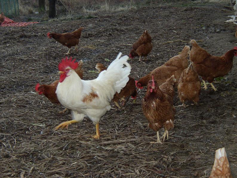 写真はオンドリを中心にして遊ぶニワトリ達。