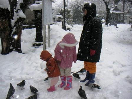 お宮さまの周りに集まってくるハトのほうが、参拝よりも興味があるようですね。