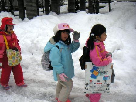 舞ちゃんは、おともだちと一緒に雪の日も歩いて登園します。