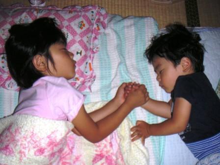 舞ちゃんとヒロくんが、仲良く手をつないで寝ています。