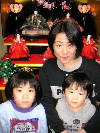 お雛様の前で「ハイ、ポーズ!」