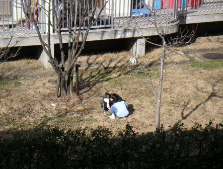 春めいた日差しの中で、子供たちが庭で仲良く遊んでいました。